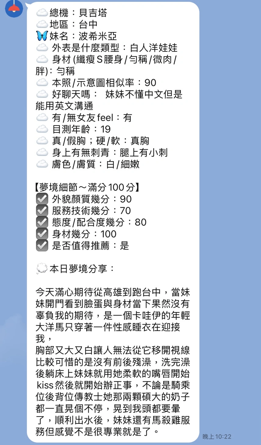 可配合 :奶砲,裸舌毒龍,按摩,69,陪洗,共浴,殘廢澡,LG(舌吻)依氣氛衛生而定,可親嘴,無套吹,戴套吹,口爆,吞精,足交,品鮑,舔蛋,奶推,屁推,顏射,浴中蕭,深喉嚨,艷舞秀,變裝(自備免付),絲襪(自備免付),玩具(按摩棒),玩具(跳蛋),情趣用品(客自備),後門,自慰秀,攝影,白人,英文溝通,快餐,2S,包夜,射後清槍