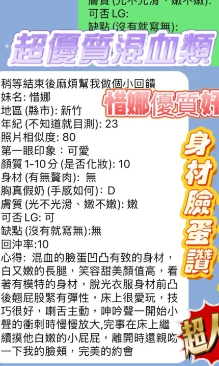 可配合 :奶砲,按摩,69,陪洗,共浴,殘廢澡,LG(舌吻)依氣氛衛生而定,可親嘴,無套吹,口爆,足交,品鮑,舔蛋,變裝(自備免付),絲襪(自備免付),自慰秀,快餐,2S,包夜