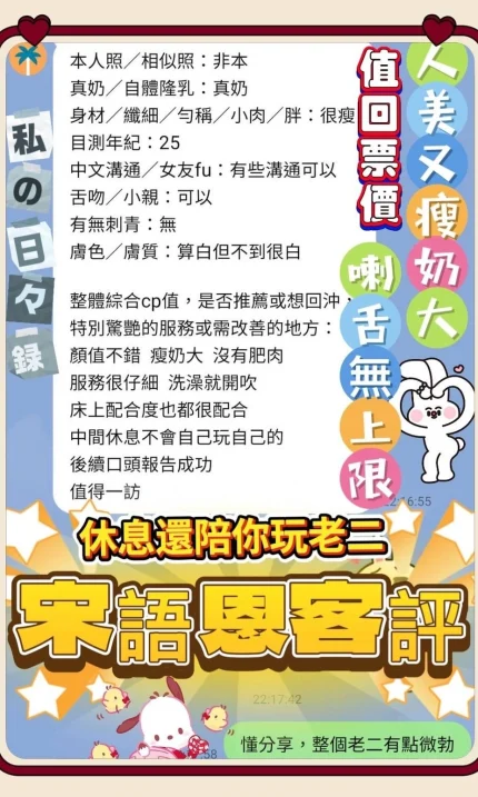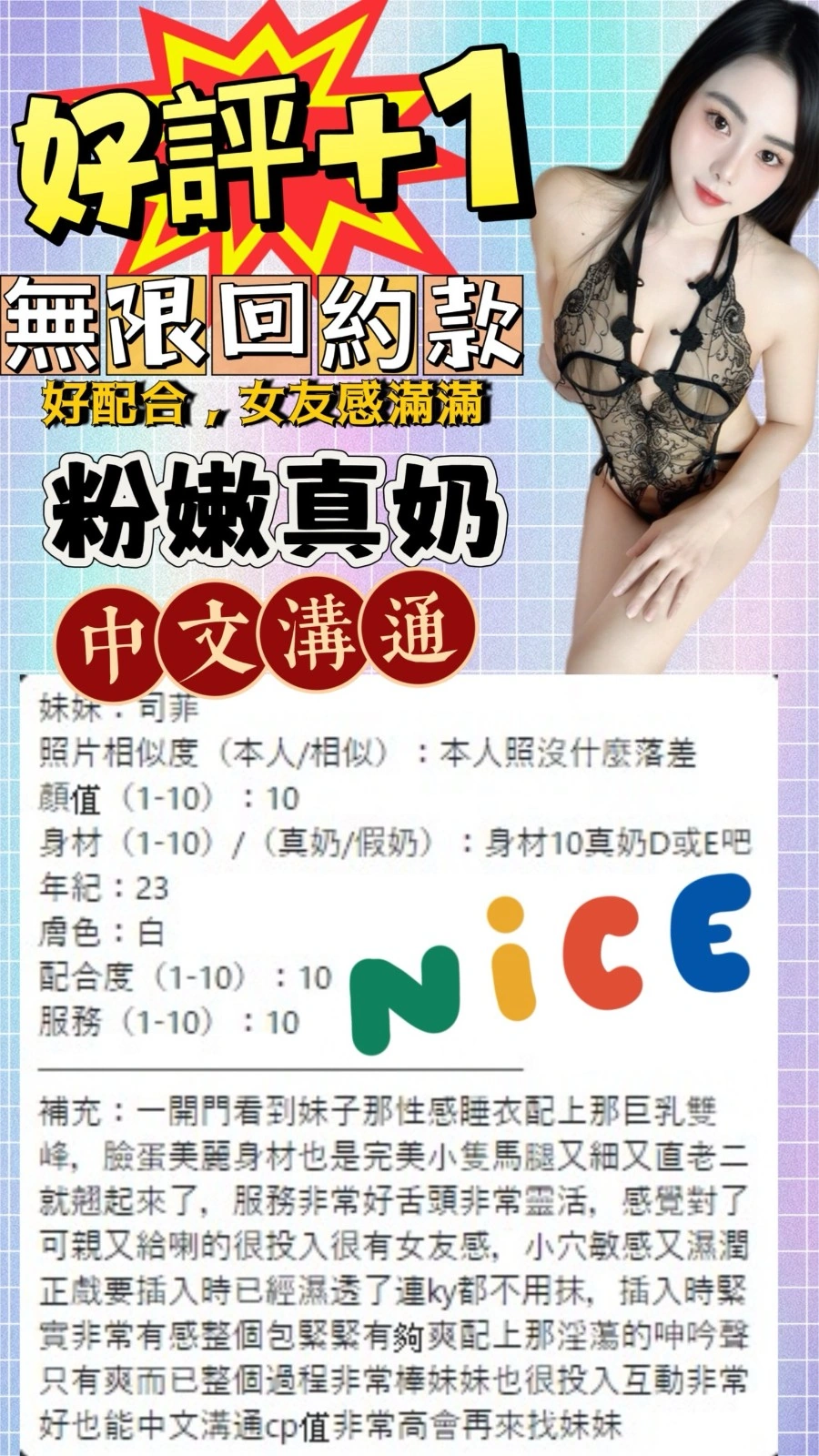 可配合 :奶砲,按摩,69,陪洗,共浴,殘廢澡,LG(舌吻)依氣氛衛生而定,可親嘴,無套吹,口爆,足交,品鮑,舔蛋,深喉嚨,變裝(自備免付),絲襪(自備免付),自慰秀,中文溝通,快餐,2S,包夜