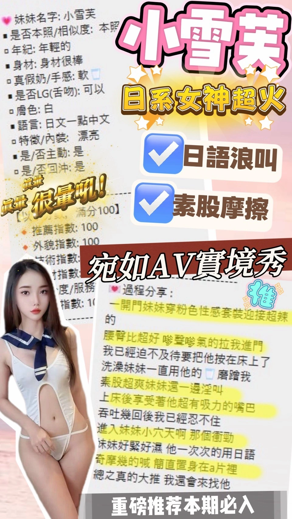 可配合 :奶砲,毒龍,按摩,69,共浴,殘廢澡,可親嘴,無套吹,口爆,吞精,足交,品鮑,舔蛋,奶推,屁推,顏射,變裝(自備免付),絲襪(自備免付),玩具(按摩棒),玩具(跳蛋),情趣用品(客自備),自慰秀,中文溝通,快餐,2S,包夜
