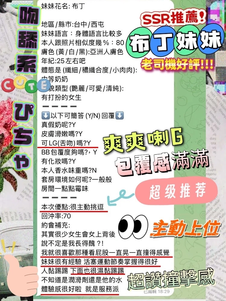 可配合 :奶砲,按摩,69,共浴,LG(舌吻)依氣氛衛生而定,可親嘴,無套吹,品鮑,奶推,屁推,浴中蕭,絲襪,無套做,無套內射,快餐,2S,NS