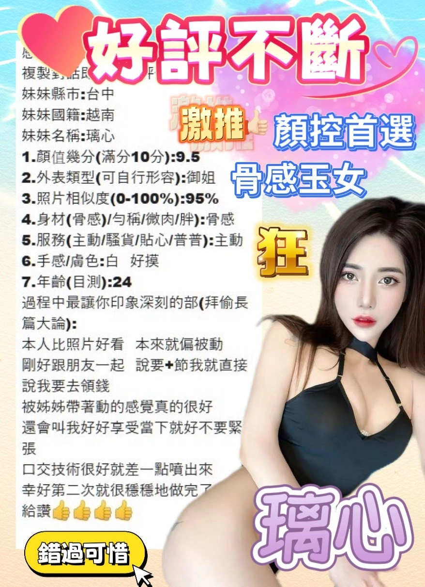 可配合 :奶砲,毒龍,按摩,69,殘廢澡,LG(舌吻)依氣氛衛生而定,可親嘴,無套吹,口爆,足交,品鮑,舔蛋,變裝(自備免付),絲襪(自備免付),自慰秀,攝影,中文溝通,快餐,2S