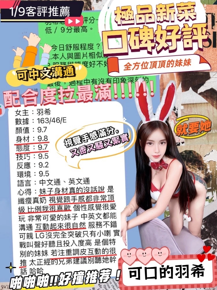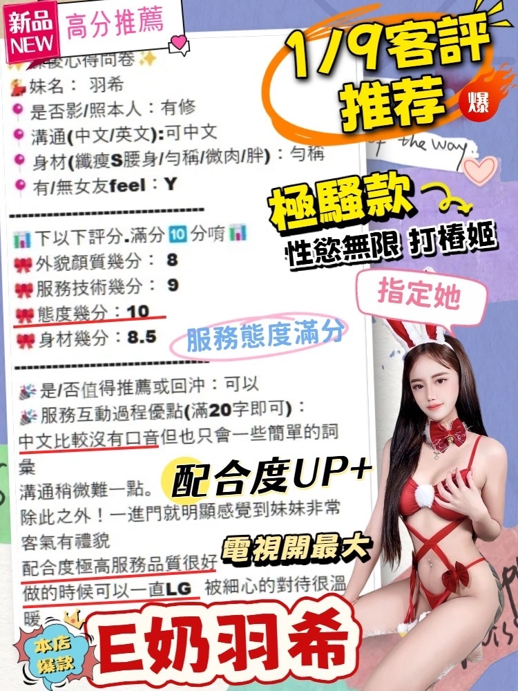 可配合 :奶砲,按摩,69,共浴,LG(舌吻)依氣氛衛生而定,可親嘴,無套吹,口爆,吞精,品鮑,舔蛋,奶推,屁推,顏射,浴中蕭,絲襪,玩具(按摩棒),玩具(跳蛋),情趣用品(客自備),無套做,無套內射,自慰秀,中文溝通,快餐,2S,NS,包夜