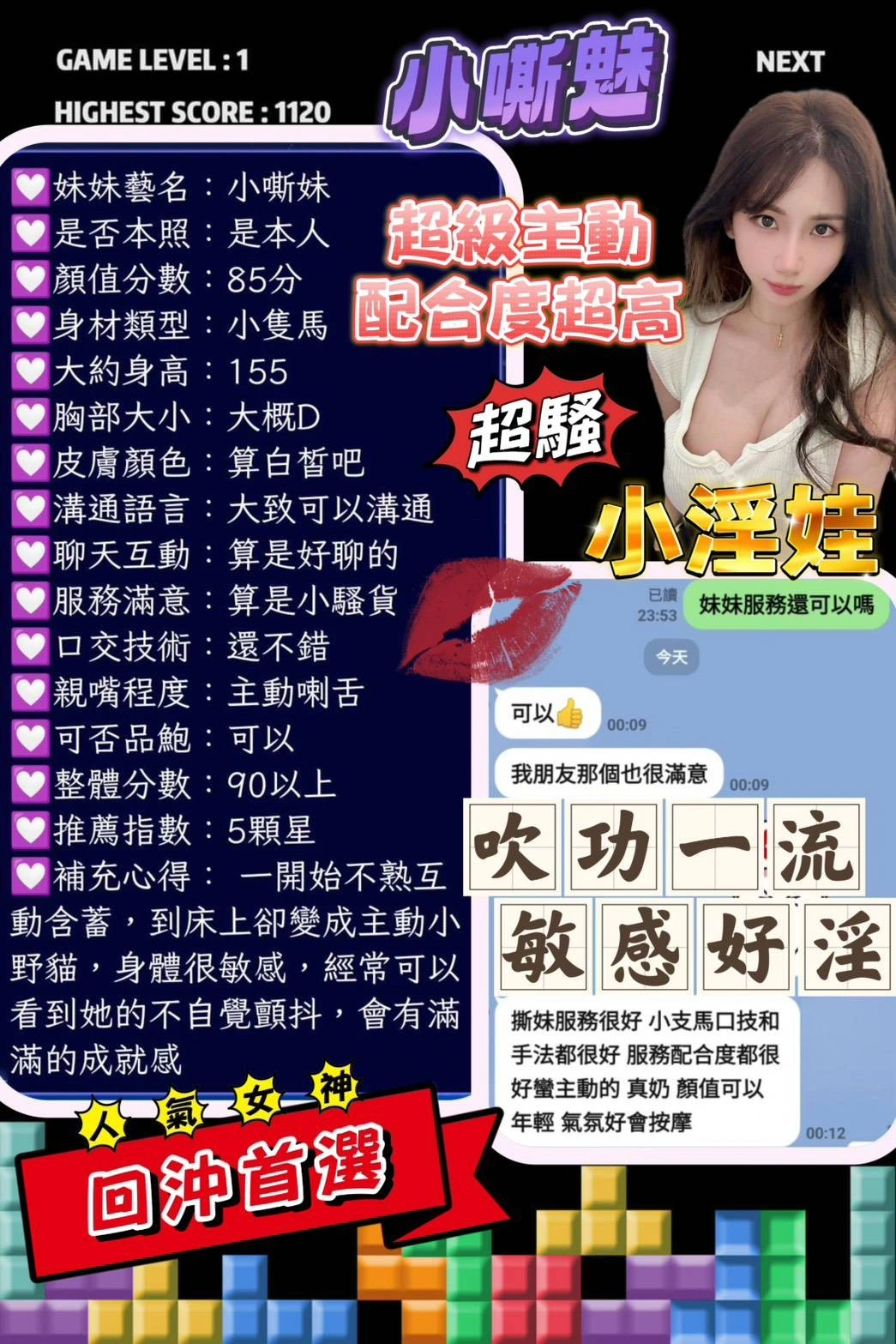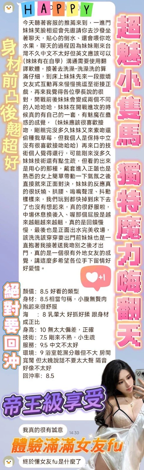 可配合 :奶砲,按摩,69,陪洗,共浴,LG(舌吻)依氣氛衛生而定,可親嘴,無套吹,品鮑,舔蛋,顏射,快餐,2S