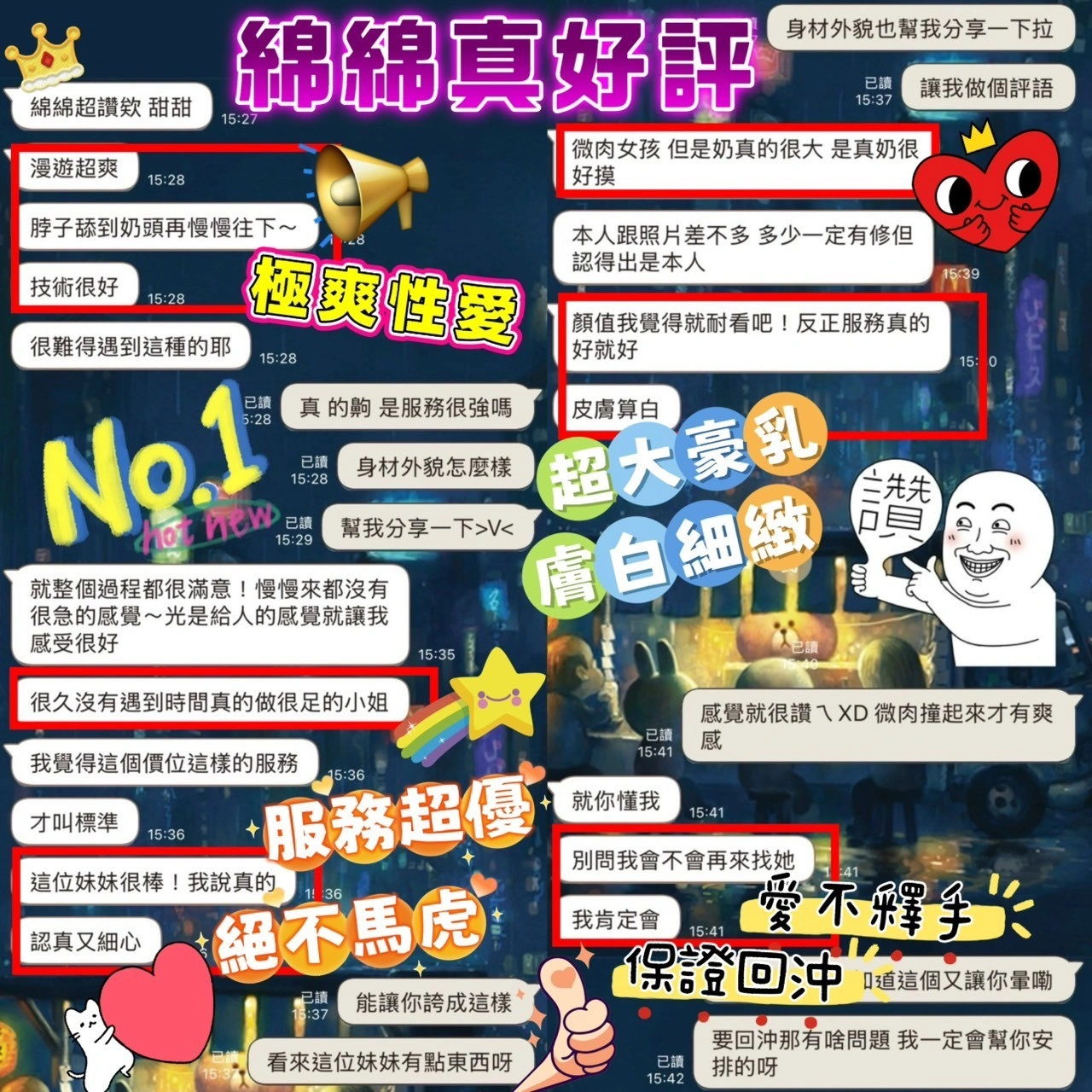 可配合 :奶砲,毒龍,按摩,69,共浴,LG(舌吻)依氣氛衛生而定,可親嘴,無套吹,口爆,品鮑,奶推,屁推,浴中蕭,深喉嚨,變裝(自備免付),絲襪(自備免付),快餐,2S,包夜