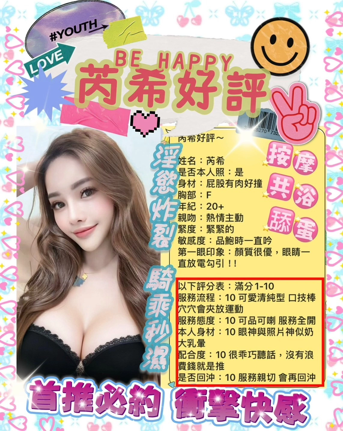 可配合 :奶砲,按摩,69,共浴,LG(舌吻)依氣氛衛生而定,可親嘴,無套吹,口爆,品鮑,奶推,屁推,浴中蕭,變裝(自備免付),絲襪(自備免付),快餐,2S