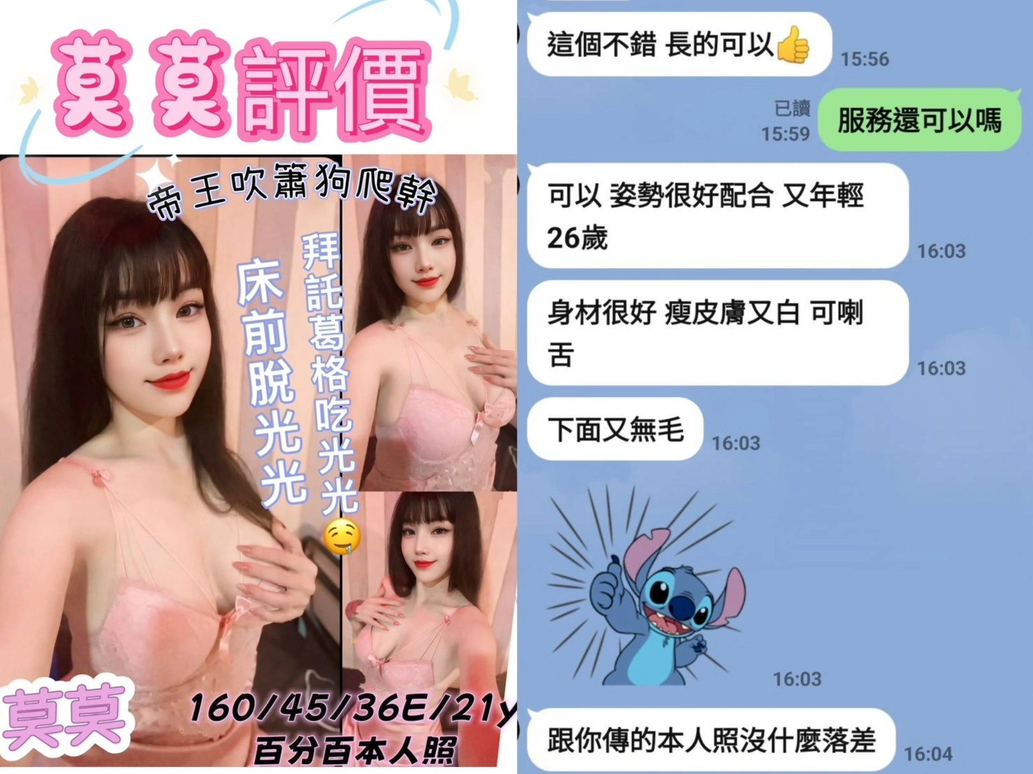 可配合 :奶砲,按摩,69,共浴,LG(舌吻)依氣氛衛生而定,可親嘴,無套吹,品鮑,輕功,奶推,絲襪(自備免付),玩具(按摩棒),玩具(跳蛋),快餐,2S