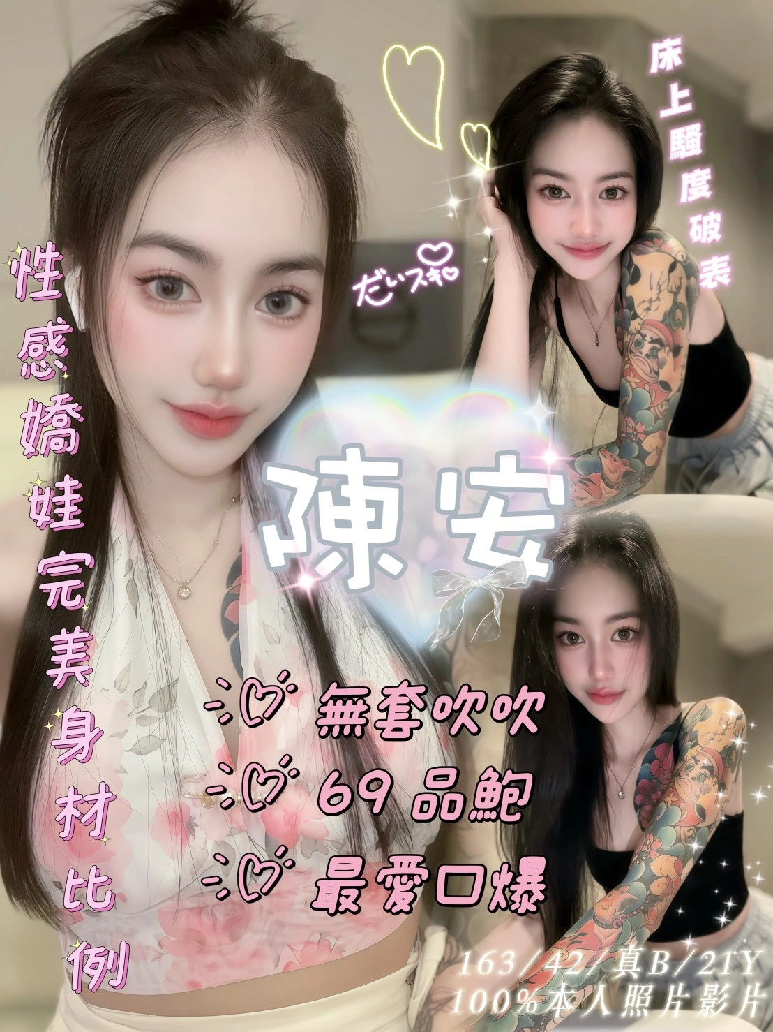 可配合 :按摩,69,共浴,LG(舌吻)依氣氛衛生而定,可親嘴,無套吹,口爆,品鮑,舔蛋,深喉嚨,變裝(自備免付),絲襪(自備免付),快餐,2S,NS,包夜