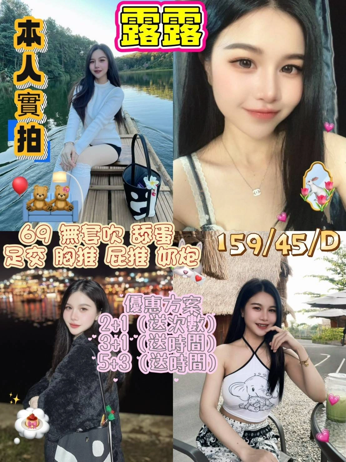 可配合 :奶砲,按摩,69,共浴,無套吹,舔蛋,奶推,屁推,浴中蕭,絲襪,快餐,2S