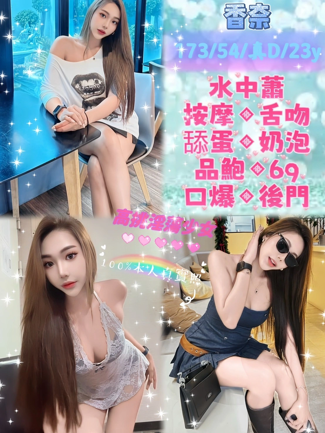 可配合 :奶砲,按摩,69,LG(舌吻)依氣氛衛生而定,可親嘴,無套吹,口爆,品鮑,舔蛋,奶推,屁推,浴中蕭,後門,自慰秀,快餐,2S