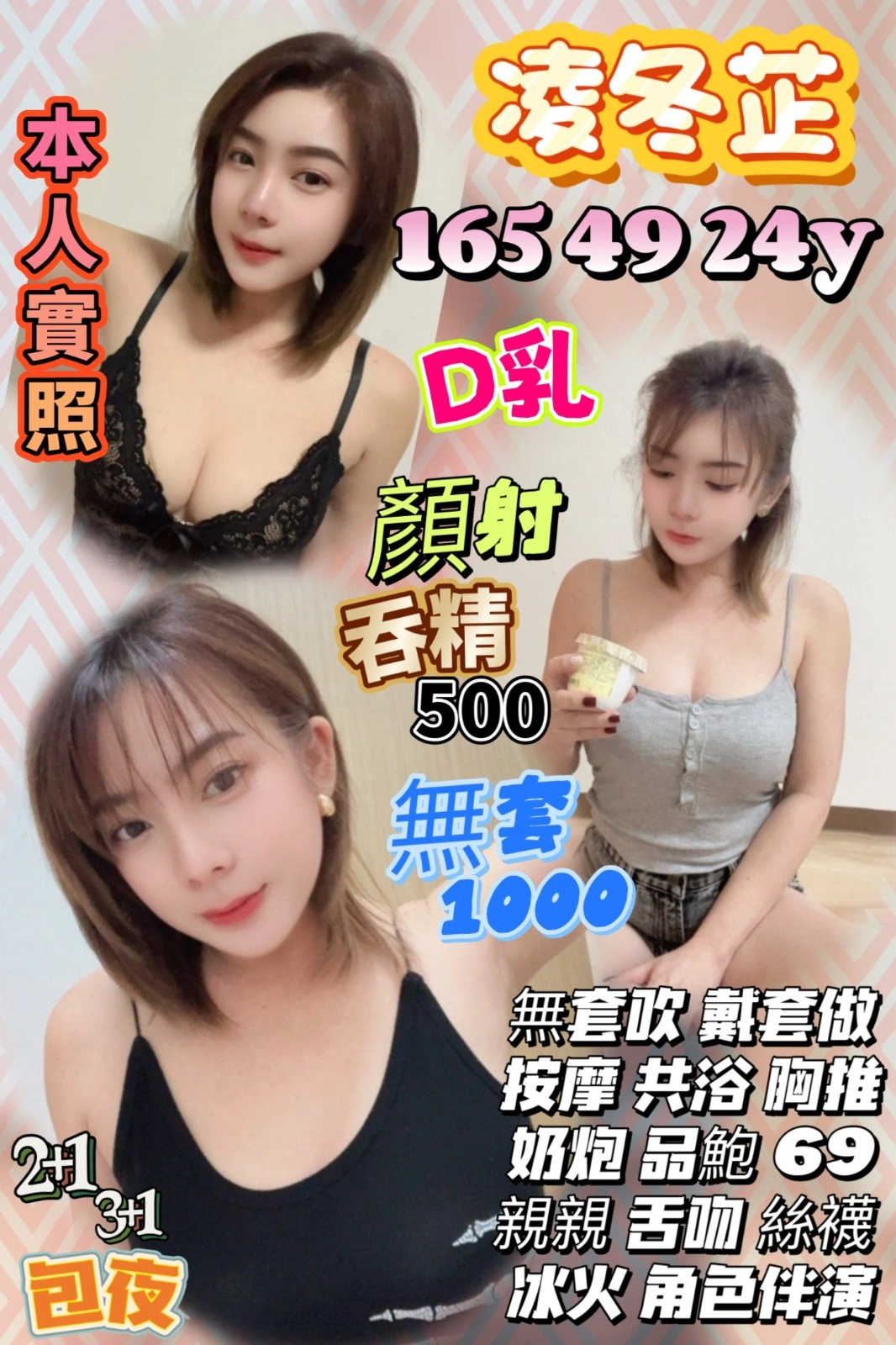 加價項目 : 2S+500(60分),顏射+500,吞精+500,無套外射+1000