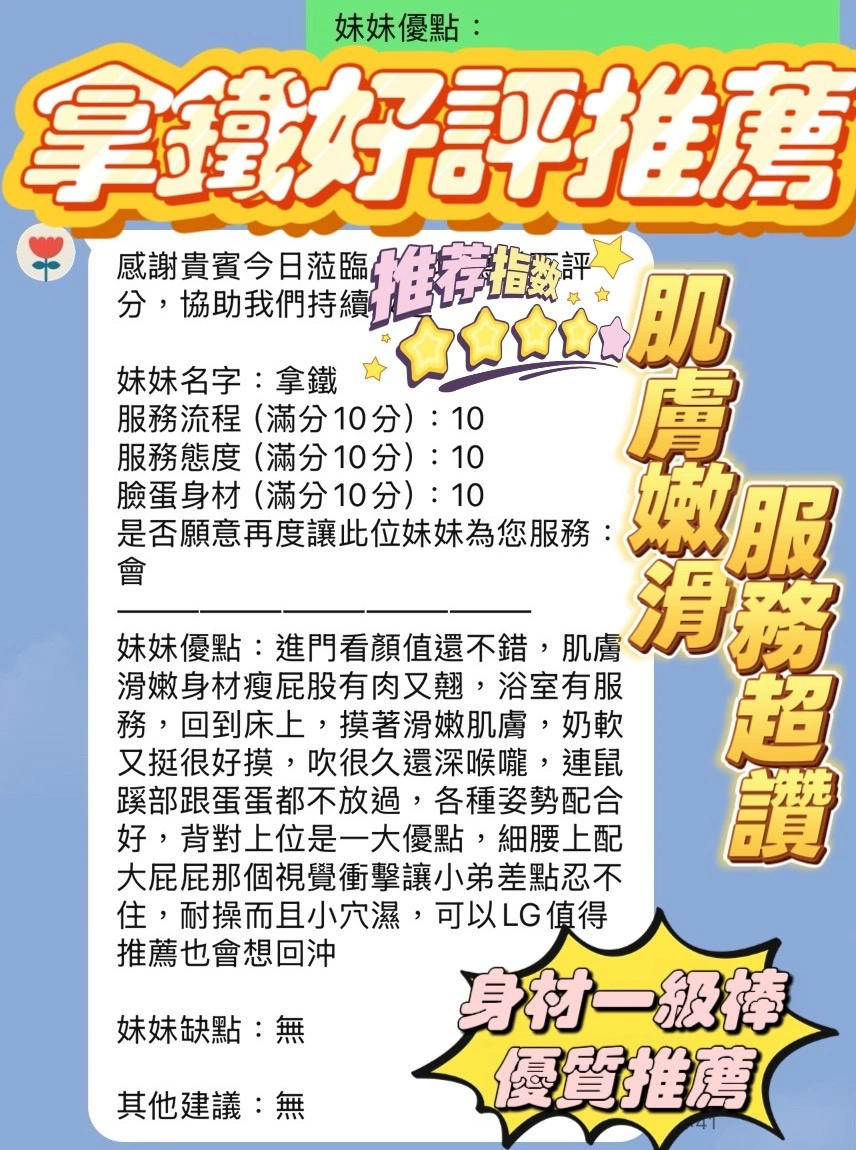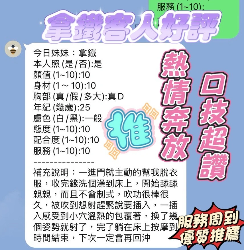 可配合 :奶砲,按摩,69,共浴,泰國浴,LG(舌吻)依氣氛衛生而定,可親嘴,無套吹,口爆,足交,品鮑,舔蛋,奶推,屁推,冰火,顏射,浴中蕭,變裝,絲襪(自備免付),快餐,2S