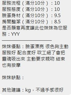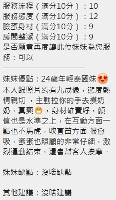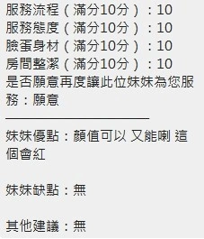 可配合 :奶砲,按摩,69,共浴,泰國浴,LG(舌吻)依氣氛衛生而定,可親嘴,無套吹,口爆,品鮑,舔蛋,奶推,屁推,水床浴,變裝(自備免付),絲襪(自備免付),後門,快餐,2S,包夜