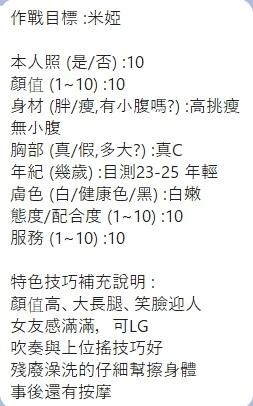 可配合 :奶砲,按摩,69,共浴,LG(舌吻)依氣氛衛生而定,可親嘴,無套吹,口爆,品鮑,舔蛋,奶推,屁推,顏射,絲襪,無套做,無套內射,自慰秀,快餐,2S