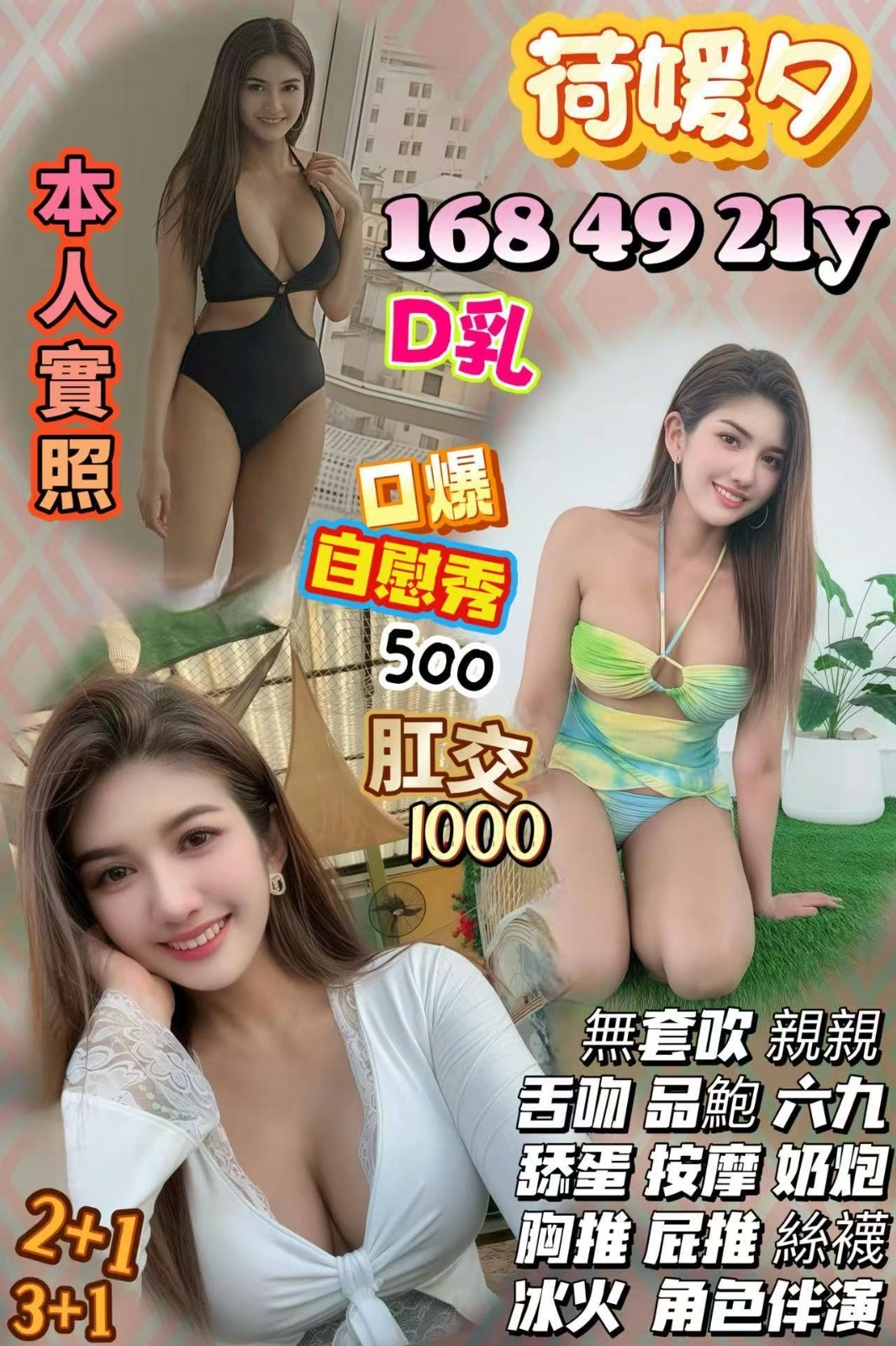 可配合 :奶砲,按摩,69,LG(舌吻)依氣氛衛生而定,可親嘴,無套吹,口爆,品鮑,舔蛋,奶推,屁推,冰火,變裝,絲襪,後門,自慰秀,快餐,2S