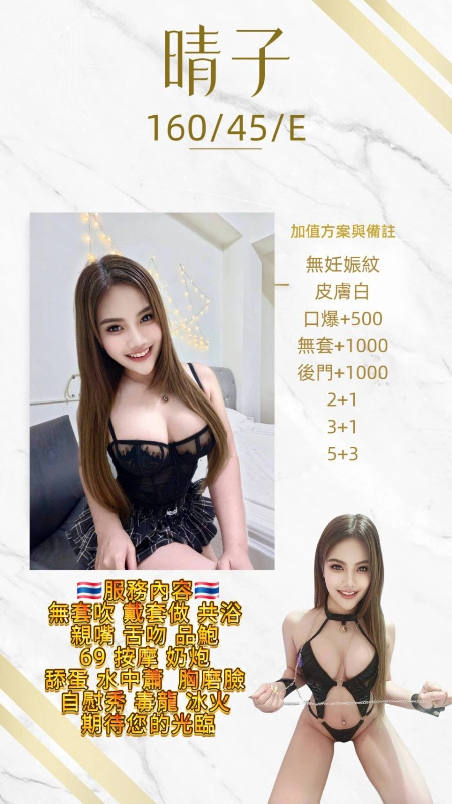加價項目 : 2S+500(60分),口爆+500,無套內射+1000,後門+1000