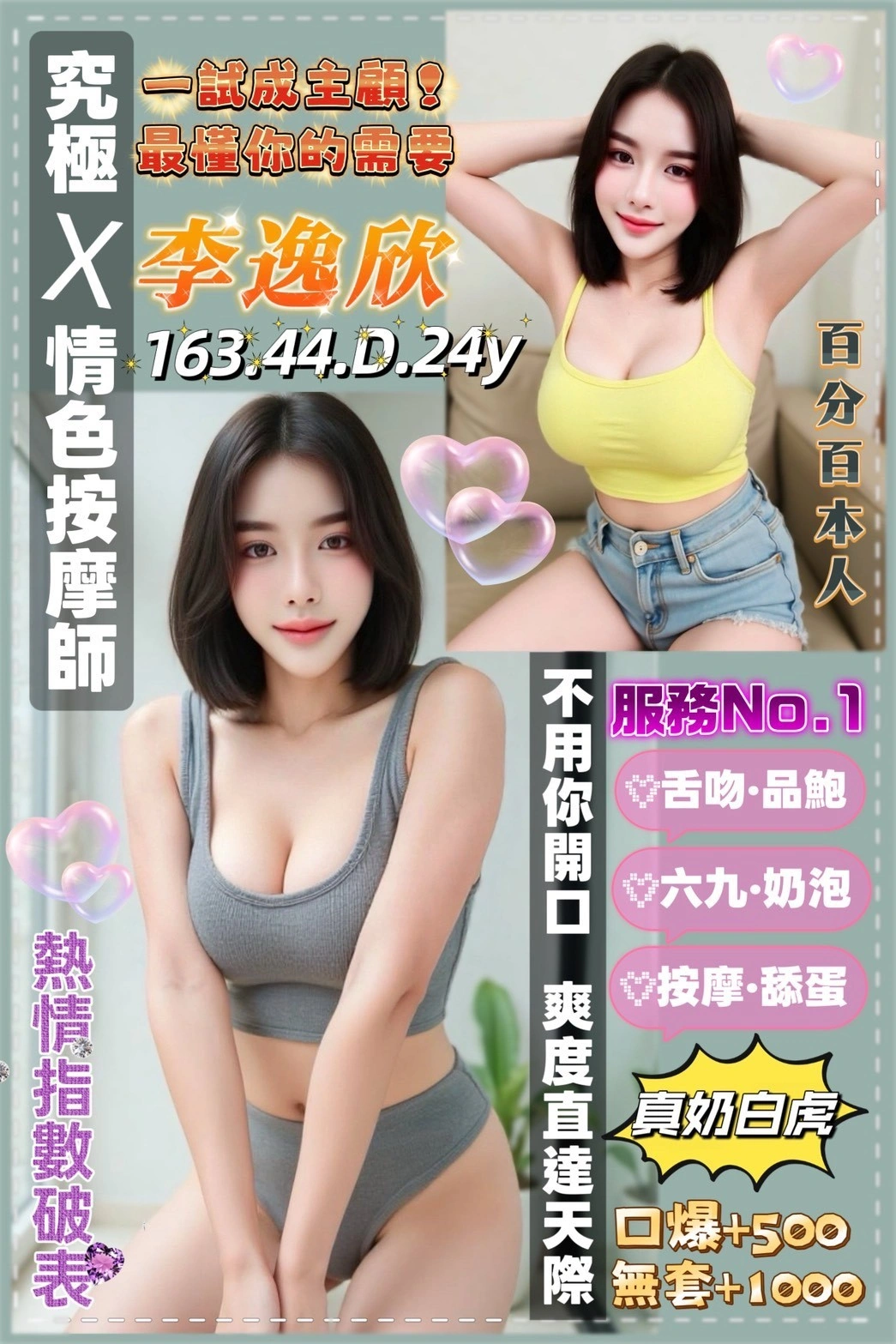 加價項目 : 2S+500(60分),無套外射+1000,口爆+500