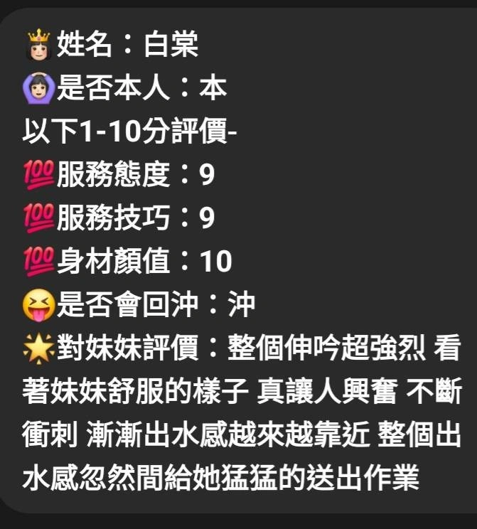可配合 :毒龍,按摩,69,共浴,LG(舌吻)依氣氛衛生而定,可親嘴,無套吹,口爆,品鮑,舔蛋,變裝(自備免付),絲襪(自備免付),玩具(按摩棒),玩具(跳蛋),情趣用品(客自備),無套做,無套內射,自慰秀,快餐,2S